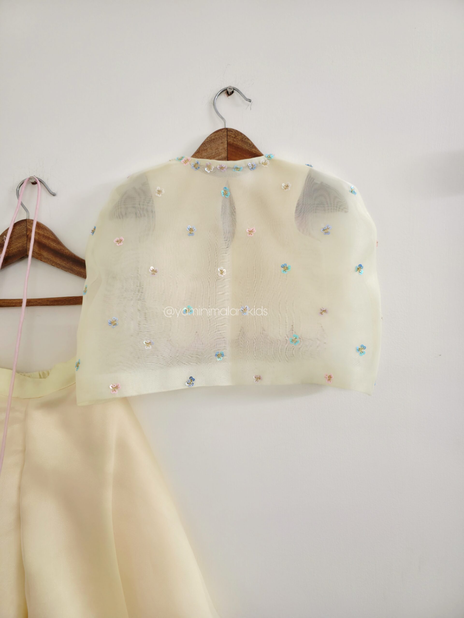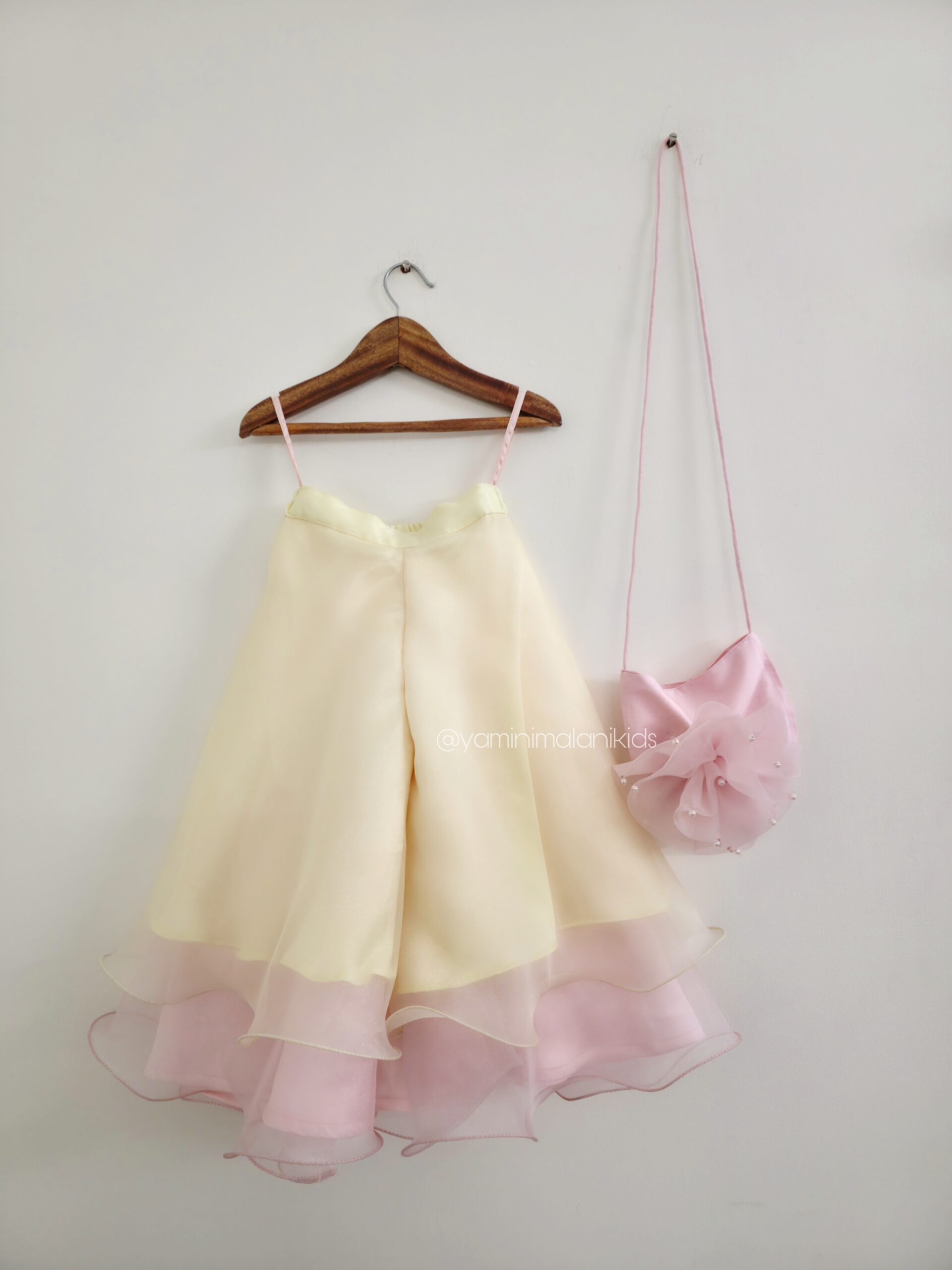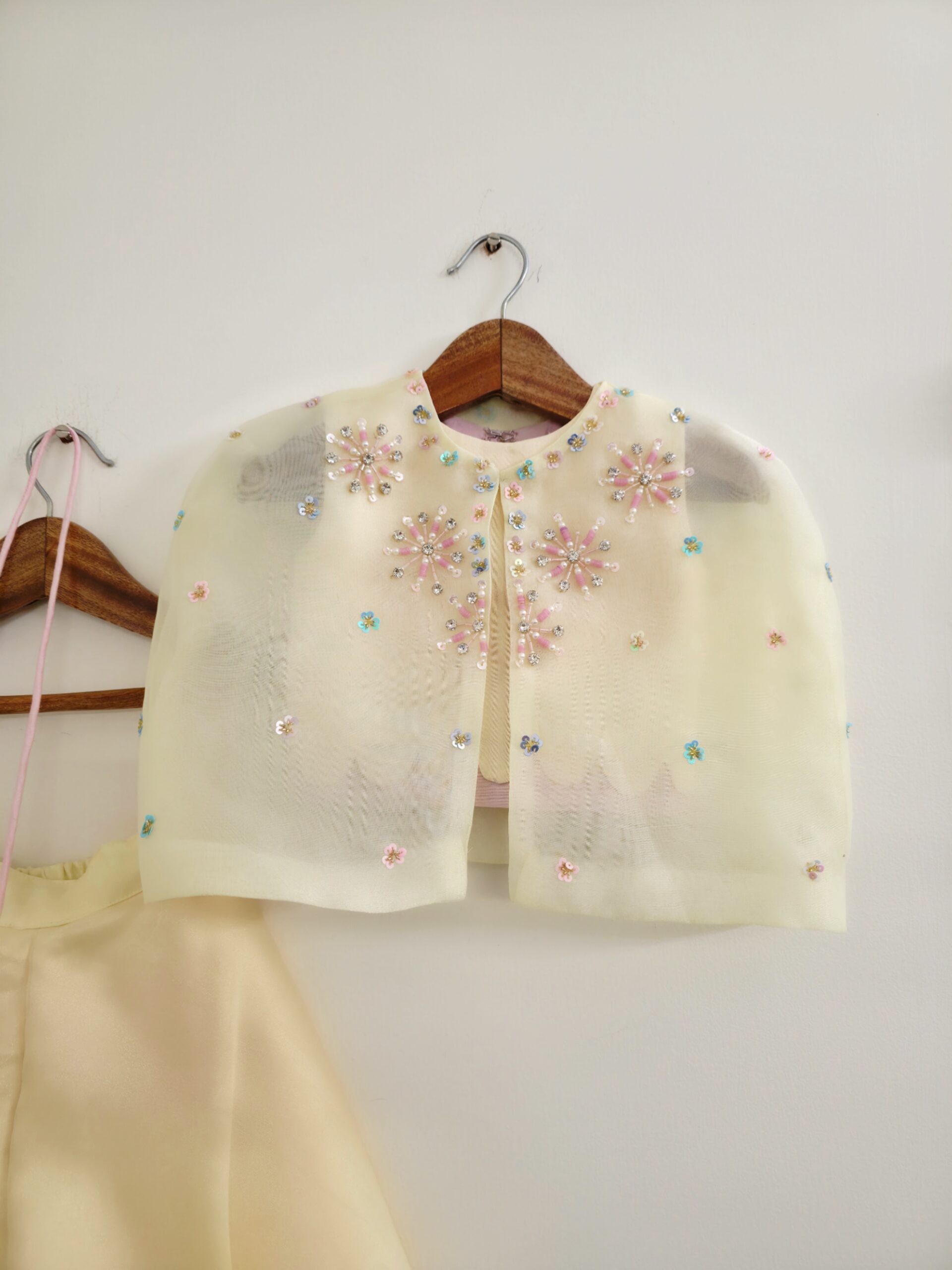 A Hand Embroidered Organza Cape, comes with a Double Layered Cropped Top and Layered Pants. The Cropped Top has a Yellow Layer Scalloped and Pink plain hemmed. The Pants in Organza is patterned in Umbrella style with Yellow and Pink Shades. The hems are picoed with Wire. The overall Set comes with a Sling Bag.