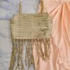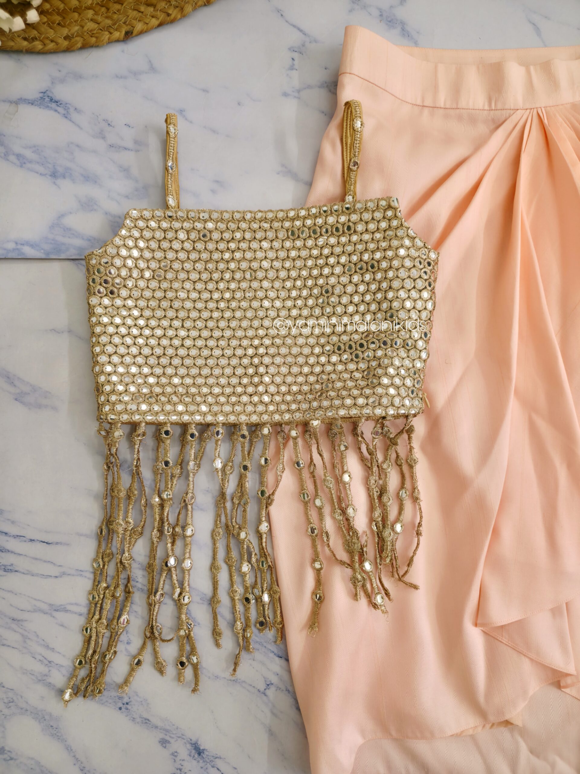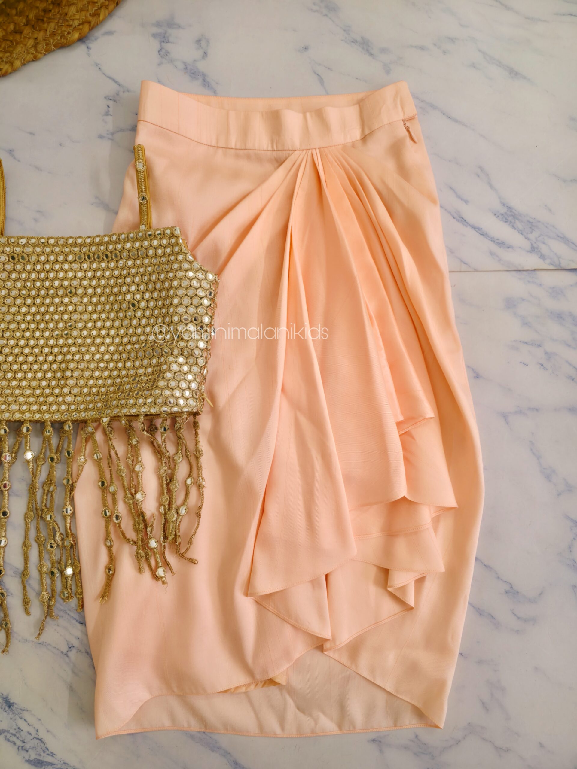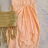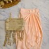 A Shiimmery Golden Blouse, paired with Peach Draped Skirt. The hanging Tassels breaks the monotony.