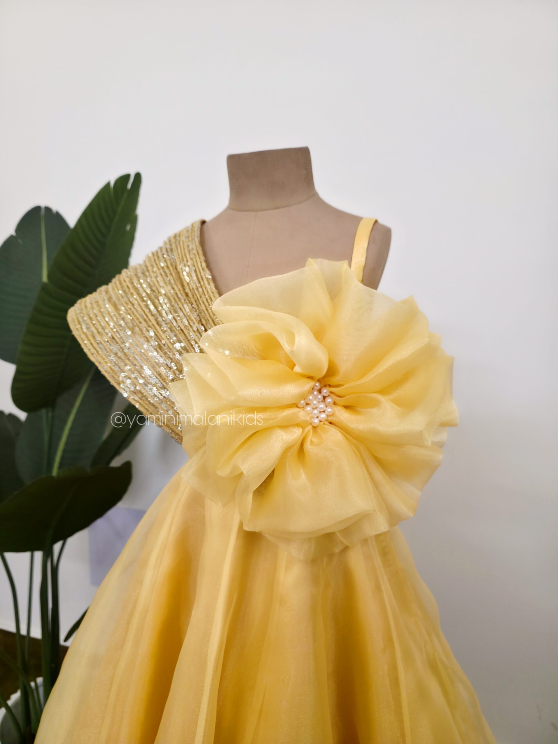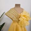 An Organza Gown, fluffed with Organza and Cancan inside, This Gown has a Sequined Wired Flap on the Yoke, with a pretty gigantic Flower detailed with Pearls on it.
